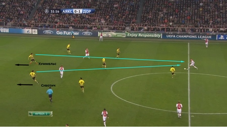 Вот еще один пример на эту тему: Хуммельс и Суботич контролируют игрока с мячом, но в данном эпизоде они начинают движение к своим воротам. И вот почему: