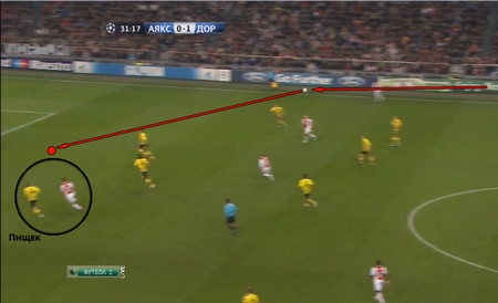 Из глубины, на левом фланге, игрок Аякса врывается за спину двум центральным защитникам. В этом эпизоде Пищек дорабатывает до конца. Он следует за своим игроком, тем самым страхуя пару центральных защитников, которые не видят игрока, забегающего за их спины из другой зоны. Отличный пример взаимной подстраховки.