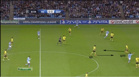 Можно сделать вывод, что Боруссия старается нейтрализовать атаки через центр путем создания плотности между линиями защиты и полузащиты. Расстояние между линиями составляет примерно 10 м. В случае, если в смежное пространство попадает мяч к сопернику, он сразу же подвергается командному прессингу со всех сторон, что очень усложняет перевод мяча в штрафную площадь обороняющийся команды.