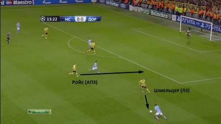 А на этом кадре показано, как Ройс закрывает зону левого защитника Шмельцера, который выдвигается на игрока, владеющего мячом.