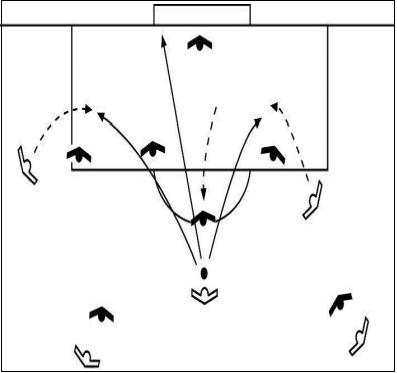 2) Применяя длинные передачи, сразу доставляя мяч ближе к району штрафной площади;