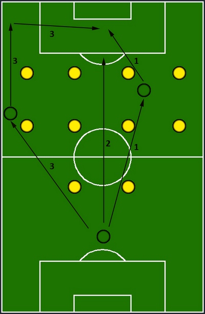 Применение длинных передач для быстрого перевода мяча на половину поля соперника может оказаться довольно опасным оружием, если в составе противника есть такие мастера, как Бэкхем или Пирло. Для них не является проблемой направить мяч на 40 м в свободное пространство на чужой половине поля. Нужно быть готовым нейтрализовать подобную опасность. Давайте посмотрим, как эту проблему решает Боруссия.