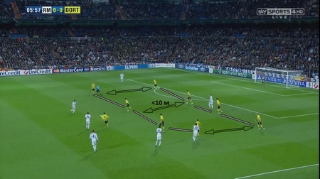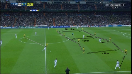 Но не об этом сейчас речь. Тут ключевым моментом является командные действия игроков Боруссии. Теперь становиться понятно, почему расстояние между линиями полузащитников и защитников составляло порядка 10 м. Получается, что до противника с двух сторон остается примерно 5 м. Этого зазора вполне достаточно, чтобы быстро зажать игрока, владеющего мячом, в так называемые тиски с двух сторон, и быстро отобрать мяч.