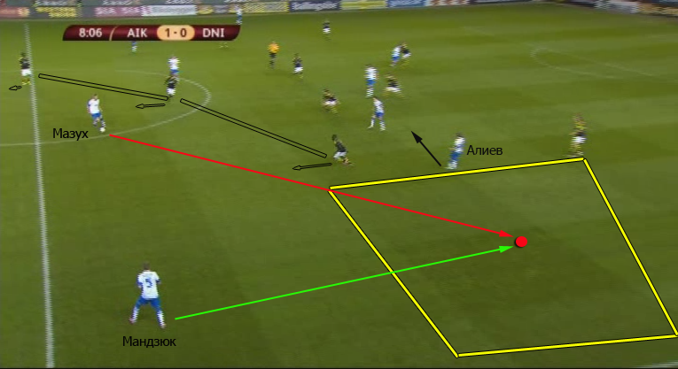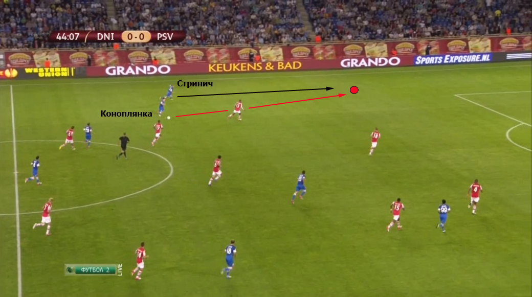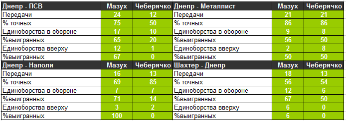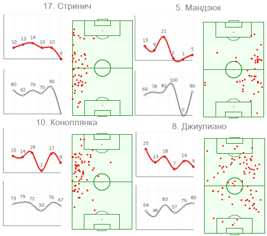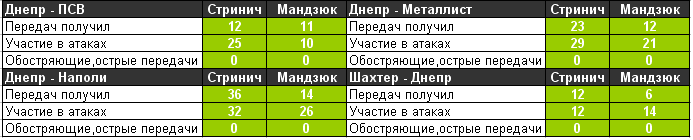 Для анализа были выбраны матчи против ПСВ, Наполи, Металлиста и Шахтера. Во всех рассмотренных играх на флангах в обороне Днепра действовали два игрока: Стринич – слева и Мандзюк – справа. Как можно заметить из статистических данных, Стринич чаще принимает участие в атакующих действиях. Он чаще получает мяч во время игры, а также чаще Мандзюка принимает участие в атаках. Обращает на себя внимание тот факт, что крайние защитники относительно редко получали передачи в матчах с ПСВ и Шахтером. Объяснением этому может служить то, что в этих играх Днепр строил свою игру на контратаках.