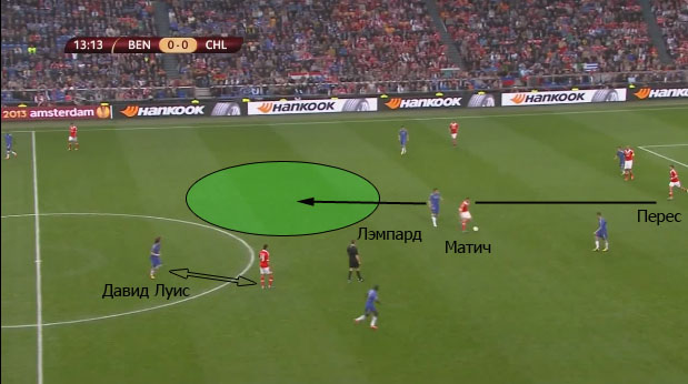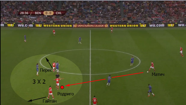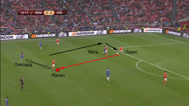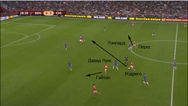 На данном стоп-кадре видно, как три игрока Беннфики искусственно создали ситуацию численного большинства 3 в 2 против двух опорных полузащитников Челси Давида Луиса и Лэмпарда. Матич, замечая мотив для комбинации (численное большинство на локальном участке поля), сразу направляет мяч в ключевую зону на Родриго.