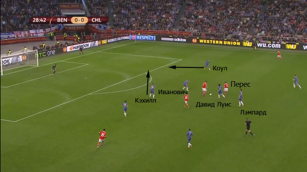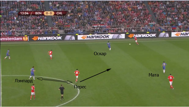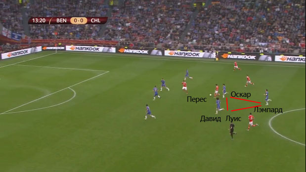 На данном снимке показан результат комбинационных действий игроков Бенфики. Линия атаки и полузащиты Челси находится за спиной Переса, который протянул мяч до штрафной площади соперника. В конечном итоге Оскару пришлось фолить на аргентинце, так как Лэмпард и Давид Луис уже не успевали закрыть опорную зону. Ниже можно посмотреть данный эпизод в динамике.