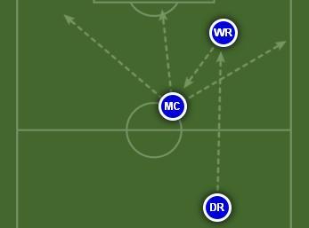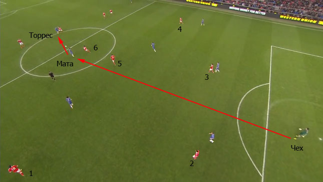 Этот розыгрыш можно считать хрестоматийным: мяч переводится в центральную зону с помощью длинной передачи на игрока атаки, который затем сбрасывает мяч назад в открытую зону.