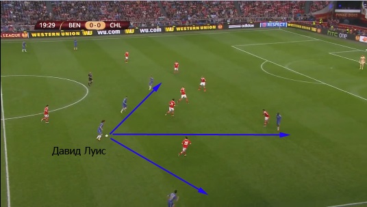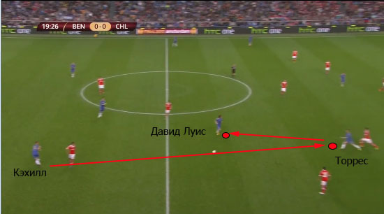 В данной ситуации Кэхилл не мог отдать мяч вперед на Давида Луиса, так как его блокирует игрок Бенфики. Гари принимает решение переправить мяч Торресу, который также подвергается прессингу, но это не мешает ему скинуть мяч на свободного Давида Луиса.