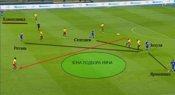 Также обращает на себя внимание позиция Коноплянки. Из-за своего широкого расположения Евгений сейчас не принимает никакого участия в атаке своей команды. Как можно усилить атаку?