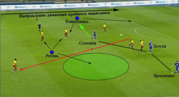 Ротань имел бы возможность заблокировать отбитый мяч, который двигался по направлению красной стрелки. Возможен вариант, когда защитник противника отбил бы мяч в зеленую зону — тогда Руслан также имел бы хороший шанс подобрать его и быстро отпасо