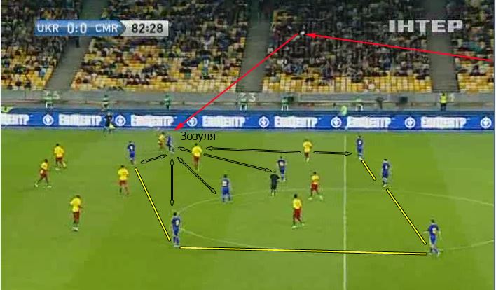 На данном снимке показано стадию развития атаки сборной Украины с применением длинной передачи, которая в конечном итоге закончилась ударом по воротам Камеруна. Обратите внимание на компактность расположения игроков нашей сборной в зоне игровых действий. Зозуля сейчас примет мяч и у него будет сразу несколько вариантов продолжения атаки. Если даже противник перехватит мяч, то на него сразу можно будет оказать коллективный прессинг группой игроков из 4-5-ти человек. Ниже вы можете просмотреть видео данного эпизода.
