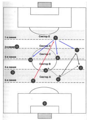 Вот вариант атаки для схемы 4-3-3, которая публиковалась в статье «Построение атакующих действий Барселоны». Игрок №6 владеет мячом, и у него сейчас есть три варианта продолжения атаки: 1) короткая передача на №4; 2) средняя передача на №2; 3) длинная передача на №7. Можно добавить еще один вариант, если сместить нападающего №9 в начало сектора D. Это необходимо для того, чтобы он смог сбросить мяч на центральных полузащитников своей команды. В противном случае он окажется без поддержки своих партнеров, что облегчит сопернику задачу по отбору мяча.