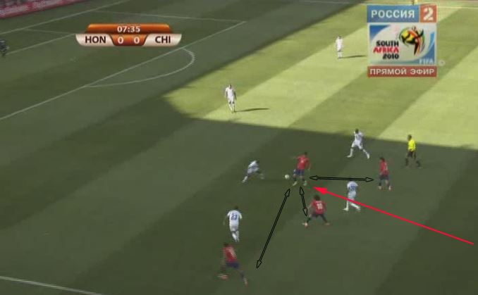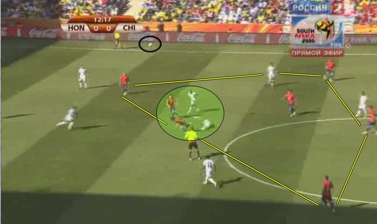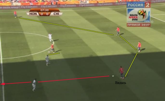 Ну, и в заключение мы приведем обещанные несколько примеров с участием сборной Чили на ЧМ-2010, которой руководил Марсело Бьелса.