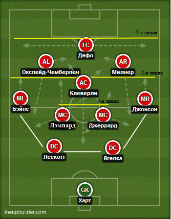 Линия обороны располагалась по дуге, обозначенной на схеме белым цветом. Бэйнс, Лескотт, Ягелка и Джонсон формировали некую чашу, внутри которой действовали Лэмпард, Джеррард и Клеверли, который также смещался в эту зону.