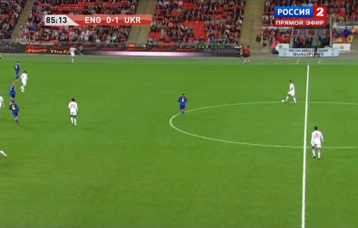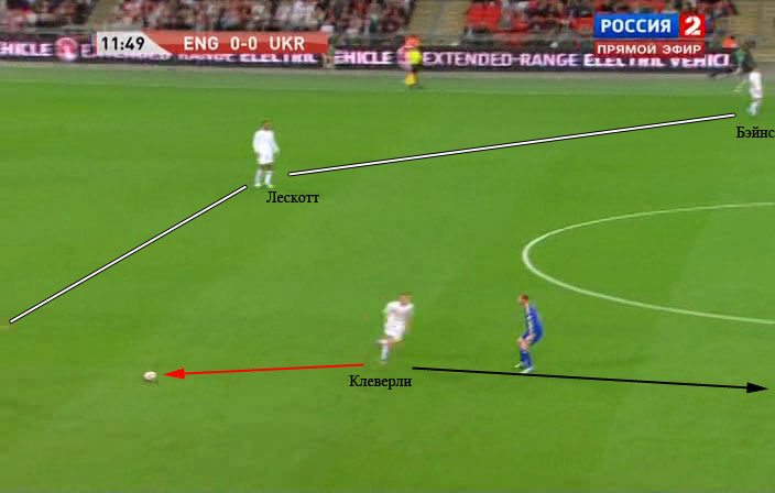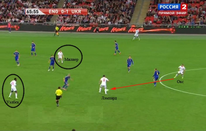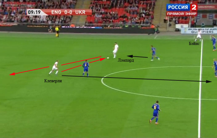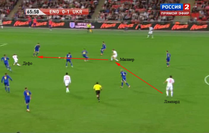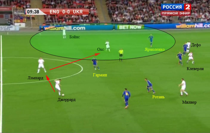 Мяч на половину поля Украины в основном доставлялся из опорной зоны. Джеррард, Лэмпард и Клеверли за счет продуманных перемещений и передач пытались перевести мяч за третью линию обороны соперника, и уже оттуда обострять атаку, выполняя передачи на одного из крайних защитников или на полузащитников в зону между 2-й и 1-й линией нашей сборной. Затем Окслейд-Чемберлен и Милнер пытались вывести Дефо на ударную позицию.