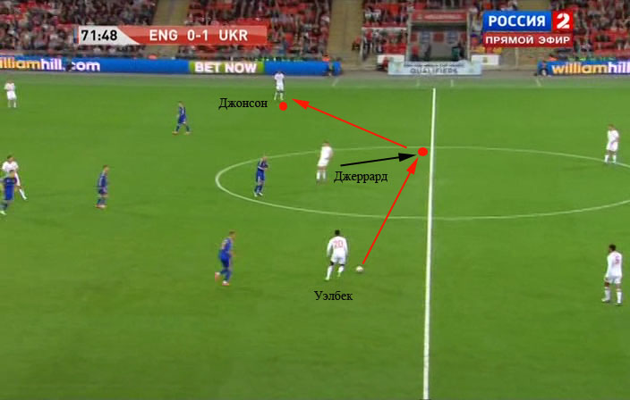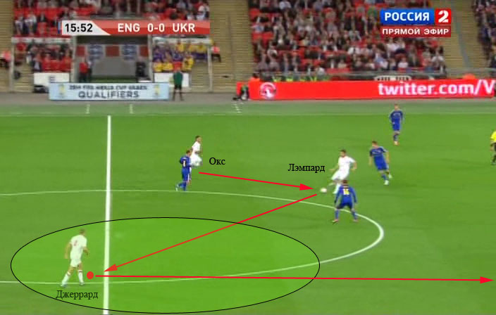 Через 12 секунд Лэмпард вновь получает мяч, но в этот раз его не успевают накрыть. Окслейн-Чемберлен также смещается к Лэмпарду и Джеррарду для оказания поддержки. Фрэнк отдает мяч Стивену и сразу устремляется за 3-ю линию обороны сборной Украины.