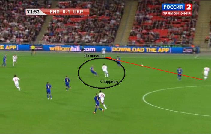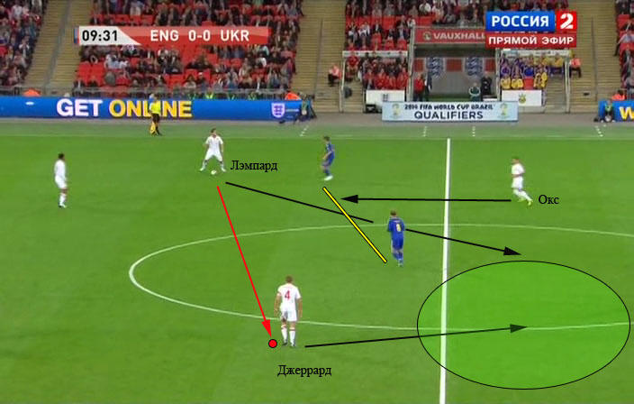 И снова дисбаланс в оборонительном построении Украины: Джеррард и Лэмпард беспрепятственно разыгрывают мяч в центре, большой зазор не позволяет Гармашу атаковать Лэмпарда в момент приема мяча. Ярмоленко на фланге сейчас абсолютно никак не препятствует Окслейду-Чемберлену получить мяч, к тому же Андрей сейчас попадает в ситуацию 1 в 2 на своем фланге. Если бы в данный момент Бэйнс включил скорость по флангу, то это еще сильнее бы повысило динамику атаки англичан.