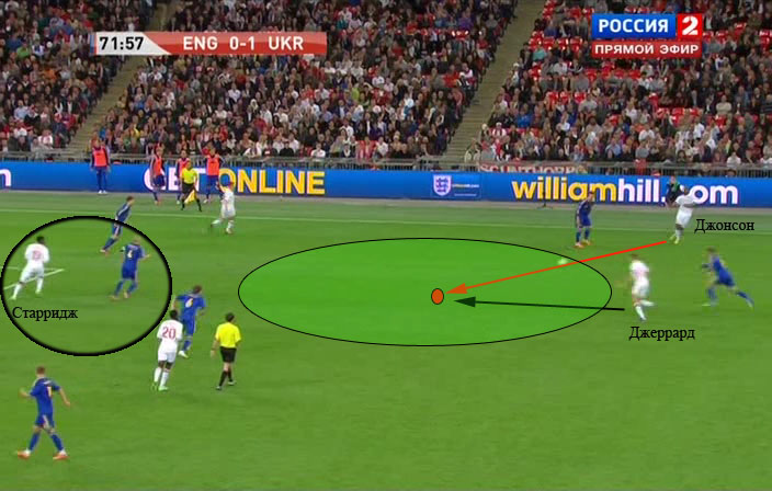 Затем мяч переводится на фланг. В дальнейшем в эпизоде ключевую роль играет Старридж, который заменил Окслейда-Чемберлена, причем игрок Ливерпуля даже не касался мяча. Как только Джонсон получил мяч от Джеррарда, Старридж сразу начал двигаться вперед, уводя за собой Тимощука и открывая пространство для Джеррарда, который врывается в открытую зону из глубины, как показано на следующем снимке.
