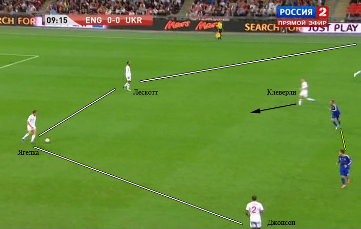 Вновь мяч разыгрывается через опорную зону. Сразу бросается в глаза дисбаланс в построении украинской сборной – вроде бы и все игроки обороняются, но с англичанами никто плотно не играет, что позволяет им спокойно разыгрывать мяч в центре поля.