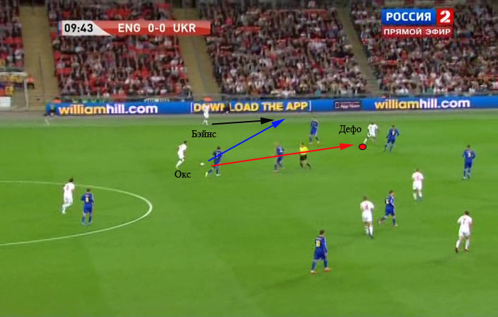 Пассивность Бэйнса можно объяснить тем, что он опасался допустить возможную контратаку через свой фланг, но сейчас видно, что фланг Ярмоленко и Гусева провисает, так как Окслейду-Чемберлену никто не мешает выполнить целенаправленную передачу на Бэйнса, по направлению синей стрелки. В конечном итоге, полузащитник Арсенала избрал вариант обострить атаку, отдав передачу на Дефо.