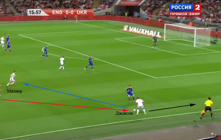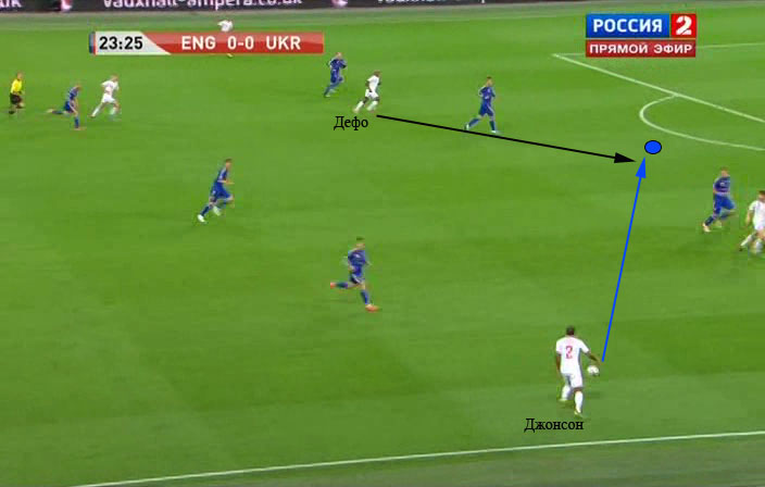 Прошло 4 секунды и вновь наблюдается разрыв между линиями у нашей сборной. Джонсон спокойно получает мяч, и если бы Дефо еще до передачи от Лэмпарда начал ускоряться по направлению черной стрелки в зону между нашими защитниками, то крайний защитник сборной Англии имел бы очень острый вариант продолжения атаки. К счастью для нас, Дефо вел себя пассивно в этом эпизоде.