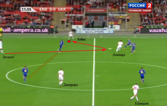 На этом стоп-кадре показано продолжение позиционной атаки сборной Англии, только в данном случае скидку выполняет Лэмпард, который попал под прессинг со стороны двух игроков нашей команды.