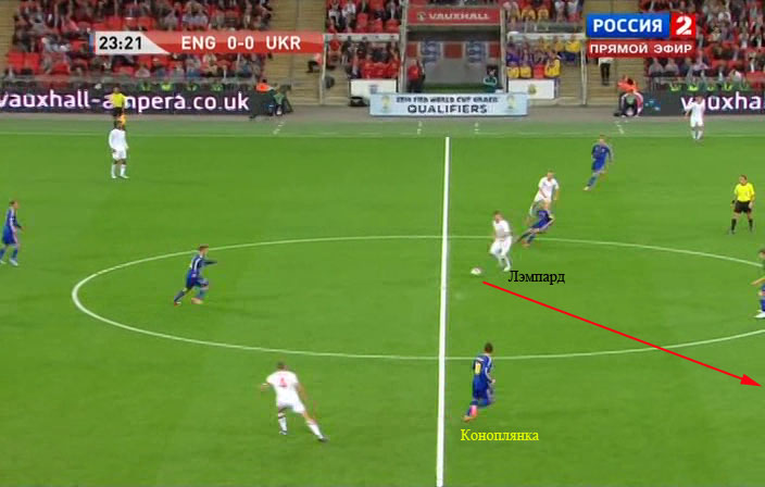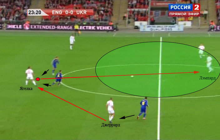 Коноплянка, Ротань и Зозуля неосмотрительно выдвинулись атаковать Джеррарда и Ягелку в центральной зоне. Этот выпад был с легкостью нейтрализован скидкой Джеррарда на Ягелку, после чего последовала передача на Лэмпарда в район центрального круга. Обратите внимание, какой разрыв сейчас образовался в построении нашей сборной между 3-й и 2-й линиями.