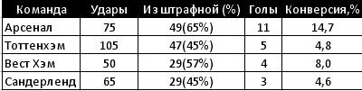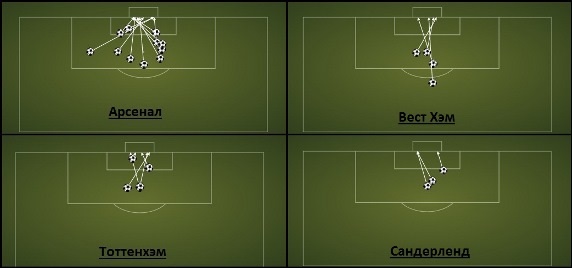 Как можно заметить, большинство своих атак Арсенал завершал в штрафной площади противников, тогда как игроки Тоттенхэма в большинстве случаев били по воротам издали. Держа в уме высказывание Земана, продолжим наш анализ. Ниже приведена обработанная информация по ударам Арсенала и Тоттенхэма в табличной форме. Также для сравнения приведена статистика Вест Хэма и Сандерленда – команд, которые находятся в нижней части турнирной таблицы.