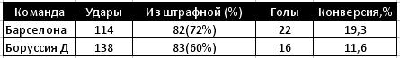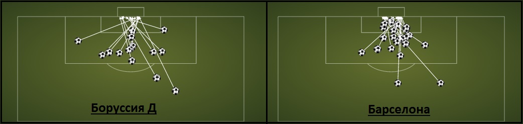 Показатели Барселоны и Боруссии выглядят лучше, чем среднестатистические для Арсенала, Тоттенхэма, Вест Хэма и Сандерленда. Также обращает на себя внимание, что, по сравнению с остальными командами, у Барселоны гораздо выше процент реализации ударов из штрафной. Обратите внимание, что на схеме Барселоны, точки из которых забивались мячи ,сконцентрированы практически в одной зоне, в непосредственной близости от вратарской площади.