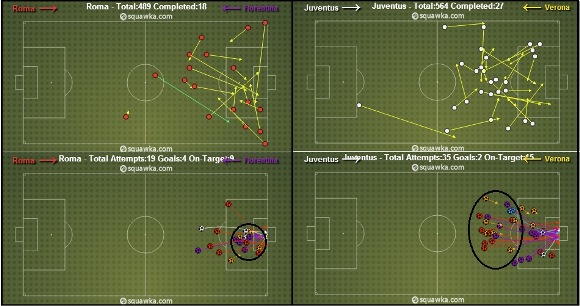 На схемах выше показан сравнительный анализ передач, после которых наносились удары по воротам. Слева показаны схемы обостряющих передач и ударов Ромы в матче против Фиорентины, который римляне под руководством Зденека Земана выиграли со счетом 4:2, а справа приведены схемы передач и ударов Ювентуса в матче против Вероны (счет 2:1).