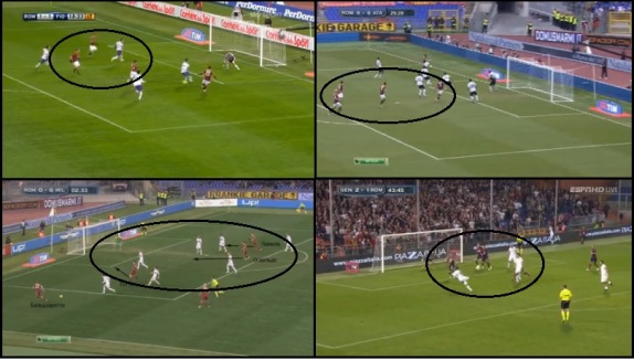 Возможно, Рома Земана не очень хорошо играла в обороне, но что касается игры в атаке, то тут чешский специалист оставил после себя огромное наследие. Одна деталь, по которой можно узнать почерк Земана – это фланговая атака, где ключевую роль играет крайний защитник, прорывающийся по флангу и выполняющий передачу в штрафную, которую готовы замкнуть минимум три игрока, как указано на снимках ниже.
