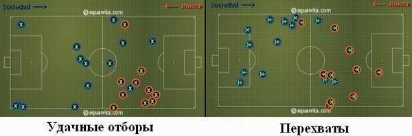 Еще более показательными в этом плане могут считаться точки удачных отборов и перехватов. Согласно данным от squawka.com, игроки Шахтера по ходу матча в подавляющем большинстве случаев удачно отбирали и перехватывали мяч на своей половине поля. В тоже время у Сосьедада наблюдается несколько другая картина, особенно это касается статистики отборов. Главное различие заключается в том, что у басков центр тяжести удачных отборов смещен в среднюю треть поля.