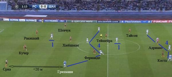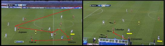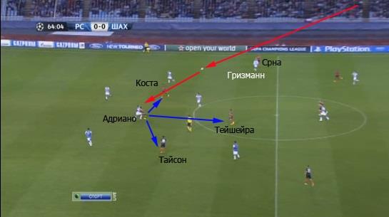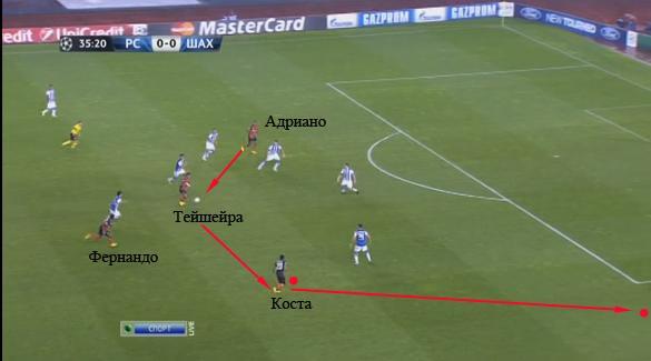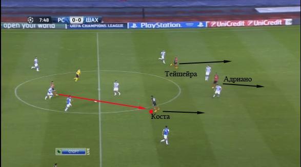 Схема атаки довольно проста: во время передачи Тейшейра отскакивает назад для того, чтобы подобрать «скидку» мяча от Луиса Адриано. Рядом с Алексом находится Дуглас Коста, который также во время передачи отрывается на несколько метров от своего опекуна. Также стоит отметить Фернандо, который в лучших традициях Фернандиньо вбегает из глубины в зону игровых действий. Спустя мгновение Коста переведет мяч на фланг в свободную зону на Срну. Таким образом, помимо рассмотренных дивидендов данного построения, мы получаем еще один положительный момент, который заключается в том, что, стягивая на себя игроков противников перед штрафной, атакующая тройка раскрывает пространство на флангах, в которое могут и должны врываться крайние защитники.