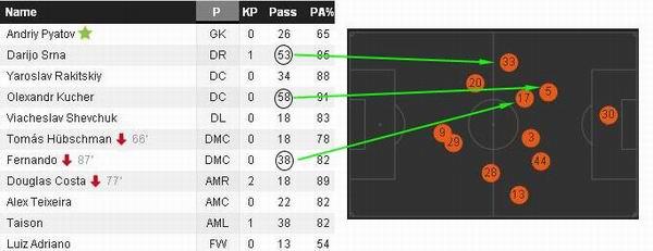 Структура игры Шахтера такова, что Кучер, получая мяч, чаще будет отдавать передачи Фернандо и Срны, которые играют в смежных зонах. Не удивительно, что Фернандо выполнил на 20 передач больше Хюбшмана. Как указывалось ранее, это связано с тем, что его позиции смещена к правому флангу, на котором играет лидер Шахтера.