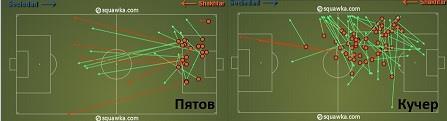 Сравните количество передач Пятова, которые посылались на левый и на правый фланг. На схеме передач вратаря Шахтера уже наблюдается смещение в зону Кучера и Срны, по крайней мере, в передачах, которые выполнялись на своей половине поля.