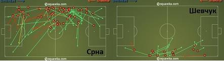Глядя на схемы передач Срны и Шевчука, можно предположить, что левый фланг сыграл очень пассивно в атаке. Но возникает вопрос: виноват ли в этом только Шевчук? Впрочем, мы несколько отвлеклись. Хотя эти рассуждения и напрямую связаны с построением игры Шахтера, но все же мы говорим об игре с Реал Сосьедадом и влиянии прессинга команды Аррасате на игру донецкого клуба.