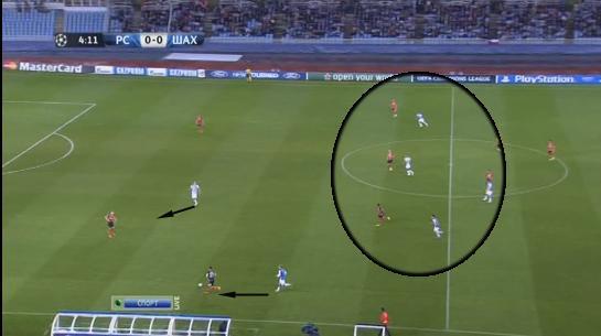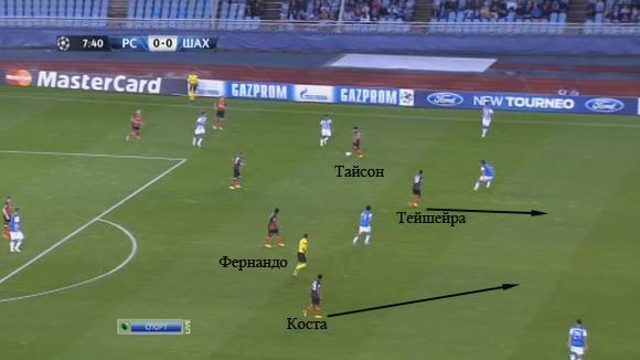 Выше показано момент смены владения. Игроки Шахтера завладели мячом. Перед Тейшейрой и Костой располагаются условные коридоры со свободными зонами, в которые они начинают вбегать (внимание), как только убедятся в том, что Тайсон сможет начать атаку. Это очень тонкий момент, который невозможно показать на снимке и описать словами. Прежде чем они начали движение вперед, после перехвата прошло 2-3 секунды. То есть они начали выходить в атаку, тем самым расширяя пространство для Тайсона, только тогда, когда убедились, что соперник уже не может перехватить мяч обратно.
