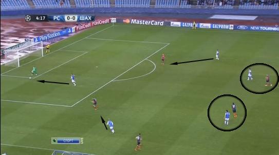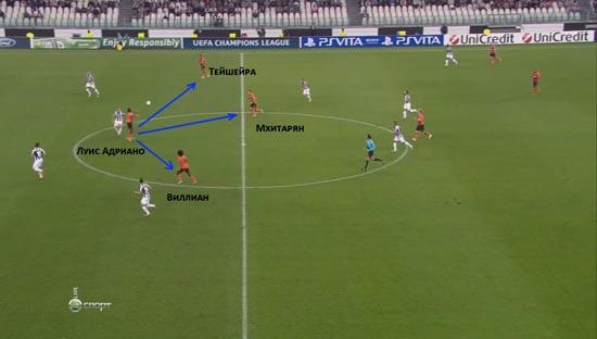 Чем угрожает обороняющейся команде подобное построение? Во-первых, защитники могут оказаться в ситуации 1 в 1 перед своими воротами, а такие игроки, как Тайсон, Бернард, Тейшейра, Дуглас Коста и тот же Луис Адриано, обладают необходимыми навыками, чтобы обыграть своего визави 1 в 1 и выйти на ударную позицию. Во-вторых, в случае попадания мяча в эту зону 3 игрока атаки могут быстро разыграть одну из типовых комбинаций для выхода на ударную позицию.