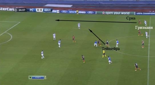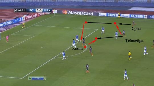 На снимке показано развитие позиционной атаки. Срна выполняет проникающую передачу в зону, где находятся Луис Адриано, Тейшейра и Дуглас Коста.