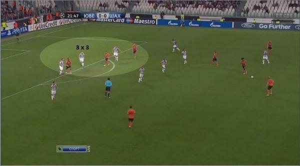Выше приведен еще один снимок из прошлогоднего матча с Ювентусом. Если внимательно посмотреть игры Шахтера, то можно заметить, что во время позиционных атак, перед штрафной площадью соперника зачастую располагаются три игрока.