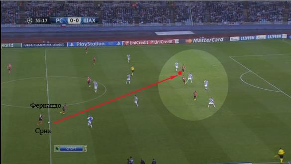 Если вернуться к снимку, на котором показано оборонительное построение сан – себастьянского клуба, то можно заметить, что у Кучера, по сути, нет острых продолжений для атаки. Опорная зона перекрыта. Можно выполнить длинную передачу, но игроки в зоне подбора не расположены плотно друг к другу, что значительно уменьшает шансы на успех побороться за мяч. Вроде бы Срна открыт, и ему можно отдать мяч. И вот тут план Аррасате начинает работать.