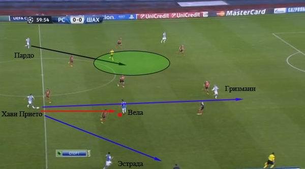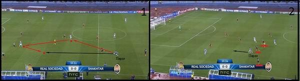 Хаби Прието отдает мяч Веле, после чего атака Сосьедада начинает двигаться к левому флангу, а спустя мгновение мяч обратно переводится на правый фланг, и вновь у игрока Сосьедада есть несколько вариантов продолжения атаки.