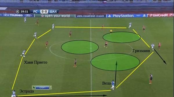 В центре Бергара играет между линиями полузащиты и защиты, контролируя зону Тейшейры. Хаби Прието и Пардо на чужой половине поля накрывают Хюбшмана иФернандо, и таким образом не позволяют им спокойно получить мяч от своих защитников. В центре получается противостояние 3 в 3. На флангах Гризманн и Вела располагаются перед Срной и Шевчуком, и только Кучер и Ракицкий играют в большинстве против Сеферовича – 2 в 1.