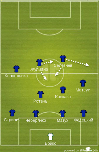 После проникновения на половину соперника Тайсон, Тейшейра и Коста чаще всего действовали узким фронтом. Такая манера игры приводила к сужению пространства в центре, но также позволяла каждому из игроков атакующего трио вступать в борьбу за нейтральные мячи. Кроме того, насыщение центральной зоны часто отвлекало внимание Жулиано, а также заставляло вингеров Днепра садиться ниже и симметрично сужать игру (см. рисунок выше). В результате этого образовывалось пространство, которое мог бы использовать один из опорных полузащитников. Однако резкие открывания вторым темпом совершали вовсе не Хюбшман или Фернандо, а Срна. Такие действия следует объяснять желанием Луческу уменьшить роль Хюбшмана и Фернандо в атакующих действиях на чужой половине.