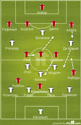На левом фланге немцы старались измотать соперника за счет постоянных смен позиций и ролей со стороны Рибери и Алабы. Сама идея данной рокировки была очень даже здравой, так как позволяла Алабе продавить соперника впереди, а Рибери при действиях в оттяжке иметь чуть больше времени для принятия решений и чуть меньше соперников, желающих отобрать у него мяч. Однако в реализации все было не так гладко. Это прежде всего было связанно с тем, что правый крайний защитник Сливочных успешно действовал по мячу и не покупался на рывки Рибери и Алабы. Кроме того, уверенно действовал ди Мария. Анхель часто оставлял Рибери у себя за спиной, и смещался к центру. Такая парадоксальная манера игры позволяла Реалу избегать горизонтальных отыгрышей соперника с фланга на фланг, а вертикали в сторону Рибери были не так опасны.