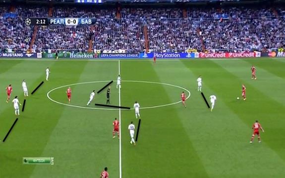 В фазе перестроений при прессинге команда старалась уплотнять игру в центральной зоне. Фактически это был переход к 4-4-2. Решающими были смещения ди Марии в центр и последующие уплотнения построений в районе центрального полукруга. Выше над этой линией располагались Бензема и Роналду. Основной идей данного приема была нейтрализация связок в полузащите Баварии, замедление темпа игры и невозможность быстрого развития комбинаций за счет действий «тройками».
