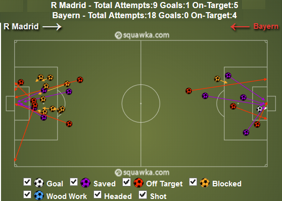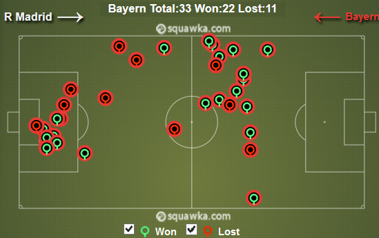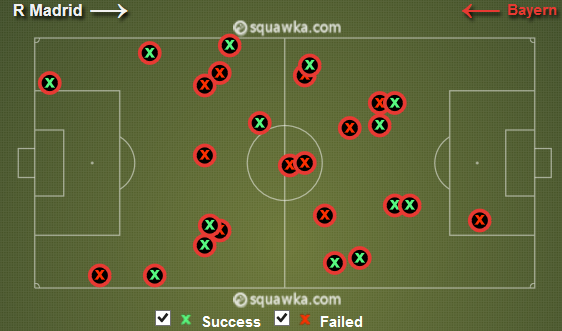 В финальной фазе позиционного нападения у Баварии чаще всего возникали обострения после передач с флангов в борьбу. Передачи между игроков на ход по центру не проходили, ввиду уплотнения игры Реалом перед своей штрафной и высокой компактности между линиями обороны и полузащиты. Это же свело на нет новомодные отыгрыши через зону на дуге у ворот соперника.