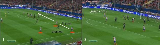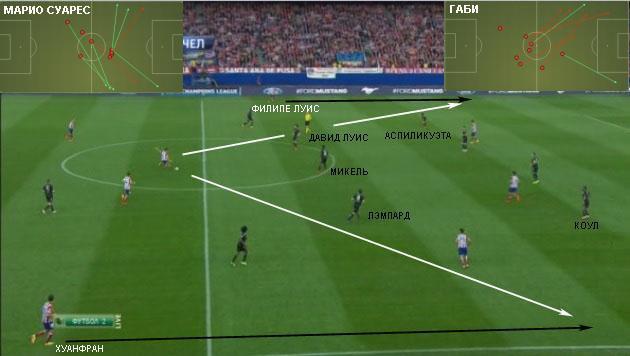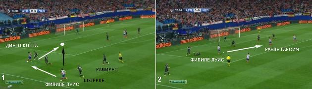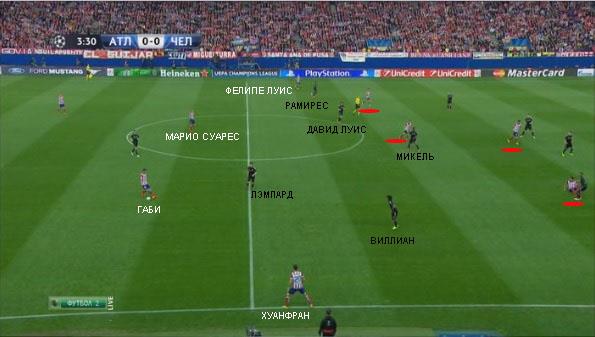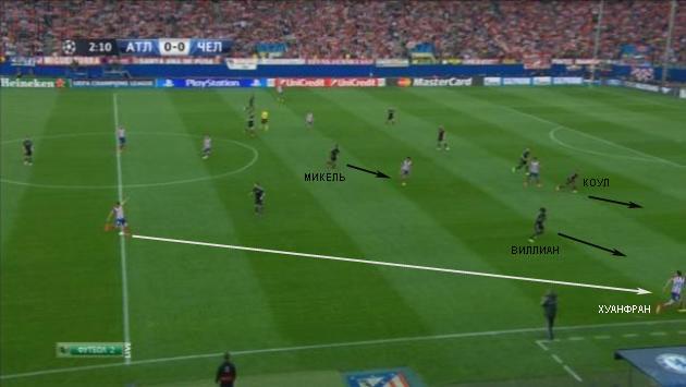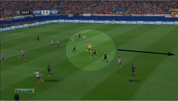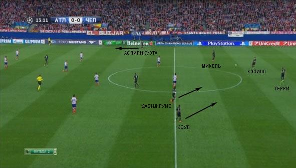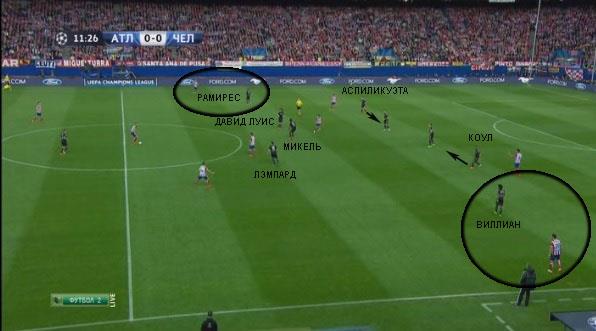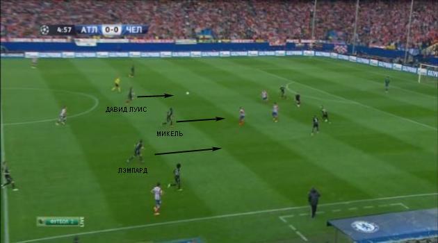 Одна из главных задач Давида Луиса, Микеля и Лэмпарда по большому счету сводилась к тому, чтобы не допустить проникающих передач себе за спину. Виллиан и Рамирес внимательно играли с крайними защитниками Атлетико, что в свою очередь позволяло Коулу и Аспиликуэте не растягивать линию обороны непосредственно перед своей штрафной.