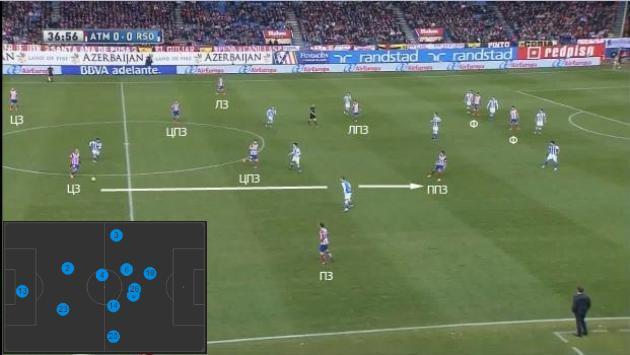 В левом нижнем углу показаны среднестатистические позиции игроков Атлетико в матче против Челси. Как можно заметить, они во многом совпадают с той позицией, которую мы разбирали на примере матча против Реала Сосьедад. Небольшое отличие заключалось в том, что Симеоне против Моуриньо сыграл с одним нападающим, позади которого действовало трио Коке – Диего – Рауль Гарсия. Выполнение проникающих передач в зону между линиями Челси на этих игроков – одна из ключевых идей данного построения.