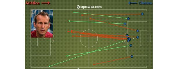 Видно, что еще до выполнения передачи на Хуанфрана, сразу три игрока Челси (Виллиан, Коул и Микель) начинают смещаться к зоне игровых действий. Согласно статистическим данным, Атлетико выполнил 44 подачи в штрафную соперника, но только 10 из них были точными, 7 из которых приводили к ударам по воротах, но нужно отметить, что эти моменты никак нельзя назвать стопроцентными.